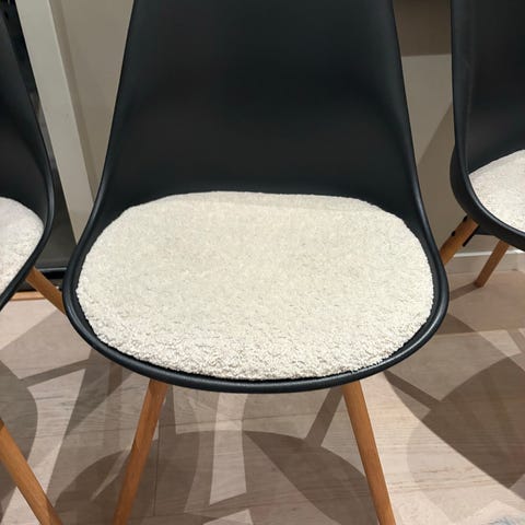 Trekkene på noen av stolene er litt solbleket øverst, og ett av trekkene har en bitteliten grønn malingsflekk på seg. Det er mulig å kjøpe nye trekk for fra en 50-lapp per stk til stolene, og de er festet med borrelås under setet, så det vil ta ca ett minutt å bytte trekk på en stol. Ellers enn det er stolene i fullt fungerende stand, uten noen tegn til slitasje på verken føttene eller sitteputene.