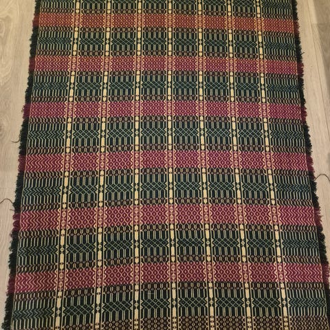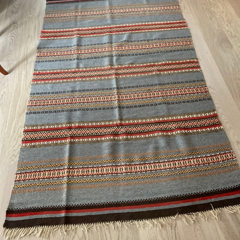 Mål: Bilde nr. 1) Gulvløper 55 x 180 2) Gulvløper 55 x 90 3) Kvadratisk veggteppe 80 x 80 4/5) Veggteppe 125 x 200 (som fremstår "nyest" og penest 6) Litt rødlig blast, som nok er vasket 7) Veggteppe med et par revner 125 x 170 8/9 er vel andre fotos av nr 1/2.