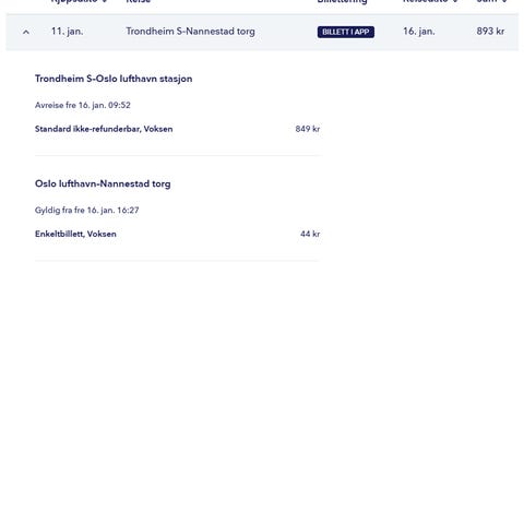 SJ Norge Togbillett Trondheim S til Oslo S 1 voksen