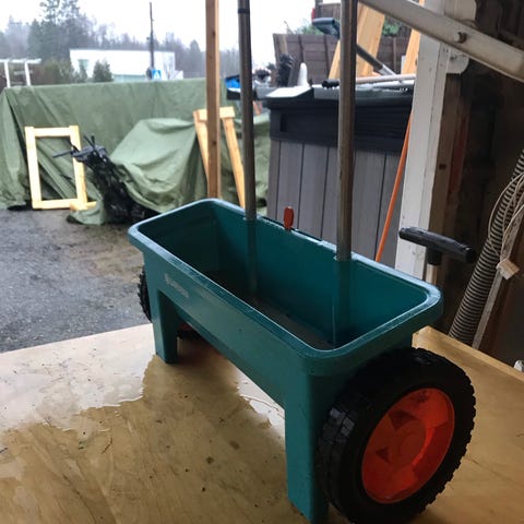 Gardena Såmaskin i blå plast med hjul. Egnet for spredning av frø i hager og plener. Utstyrt med håndtak for enkel manøvrering.