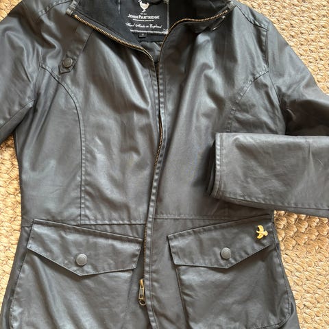 Ny oilskinjakke, Walker and Hawkes, str 16,kjøpt i september, brukt 4-5 ganger selges til halv pris kr 1500,-