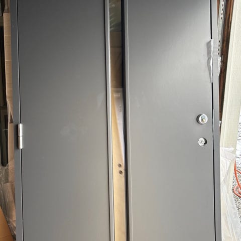 Hvit Ytter dør Tun 109 med horisontale riller. Døren har et enkelt og moderne design. Passer til standard døråpninger. 99x209 venstre hengslet. (Har 3 stk)