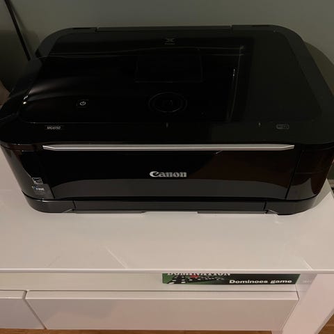 Canon Pixma multifunksjonsskriver med skannerfunksjon. Enheten har et fargedisplay og støtter utskrift, skanning og kopiering. Den har en svart plastkropp med en glass-skannerplate. Strømtilkobling på baksiden. Vet ikke hva det menes med teksten på første bildet der, mulig det bare er å bytte blekk :)