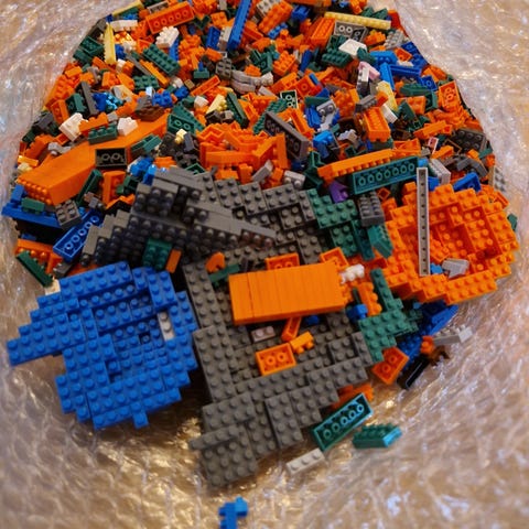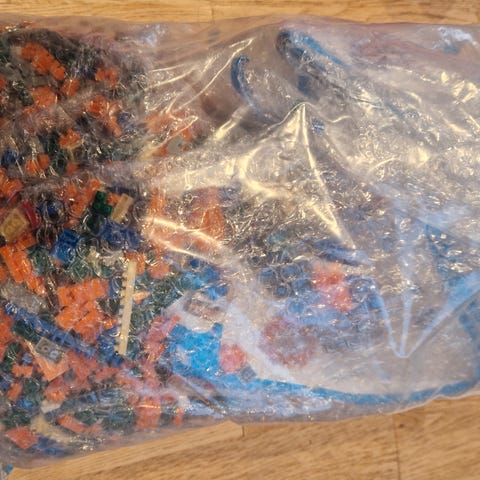 Fargerike byggeklosser i ulike former og størrelser. Med lydeffekter. Mangler nok noen klosser.
