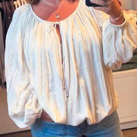 Lekker svart Miss June bluse, laget av viskose materiale. Blusen har broderte mønstre i off hvite foran, bak og på armene. Tre kvart arm lengde og en liten splitt på sidene, selges da jeg har for mye tøy. Kun brukt pent ved et par anledninger.