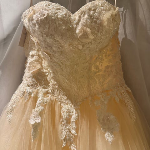 Leier denne ballkjole kjøpt på Alexandra Ritzi i Oslo. Ny pris ligger på 3500kr og den blitt sydd opp. Den er i størrelse xs, men vil passe XXS til å med S på grunn av snøringen bak. Jeg har sydd den opp så den vil passe fra 162 - 168 avhengig av hvor høye hæler du skal ha.