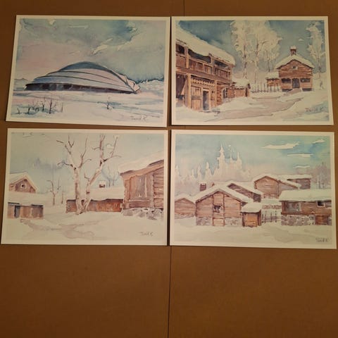 4 vakre kort i fra kunstneren Milly Heegaard. De er ikke brukt.