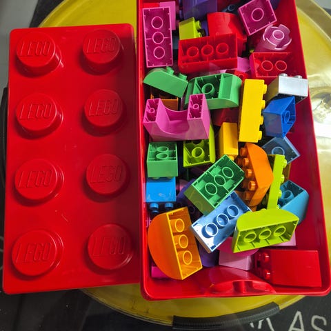 LEGO kasser til oppbevaring av leker, lego eller duplo. Rød klosse for å illustrere størrelsen.