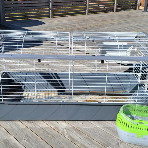 Buret er som nytt!(Kjøpt nytt i fjor sommer). Praktisk bur med stor dør slik at man kan gå inn i buret selv for å ordne for dyrene. Døren har et låsbart låsesystem som er hengslet til buret, som gir ekstra sikkerhet for dyrene😊