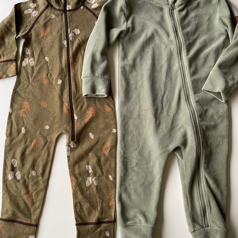 To ullpysjer i merinoull for baby str 62. Veldig lite brukt og uten bruksmerker. Farge gul og grønn med trær på. Passer for både gutter og jenter (unisex).