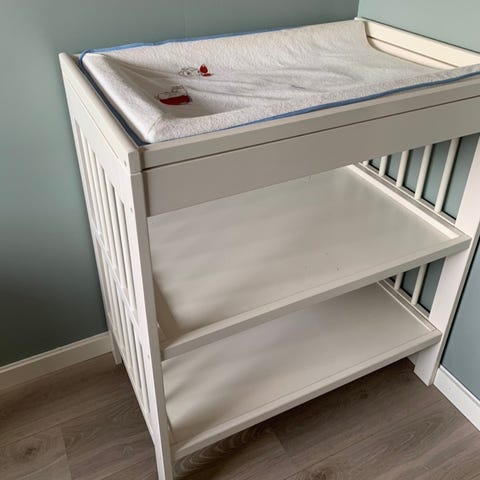 IKEA stellebord i hvit farge. Laget av robust materiale og har god oppbevaring under. Godt brukt med mye igjen.