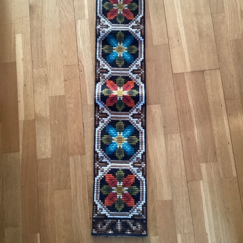 Stripete løper med mønster i fargene rosa, burgunder og beige. Tekstilen har flere horisontale mønstre i ulike nyanser og design, egnet som dekorativ bordløper. Mål: 98 cm lang uten frynser. Frynser ca 7-8 cm på hver side. Bredden er ca 48 cm.