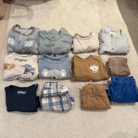 16 bukser, 8 bluser, 9 langermede bodyer, 3 kortermede bodyer, 2 pysjamaser, 1 heldrakt, 2 skjorter, 3 gensere, 6 luer.