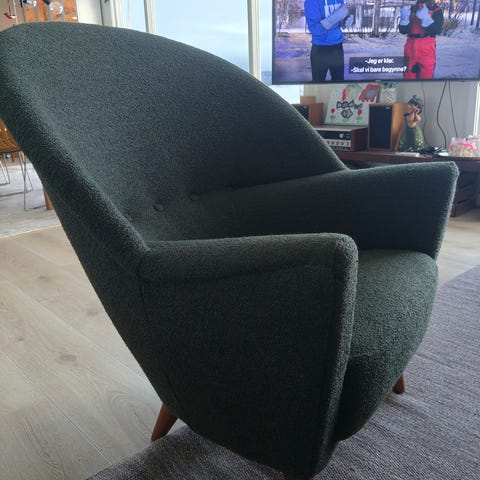«Klarinett» eller «Sopran» gynge lenestol av Møre Lenestolfabrikk | Grønt original ull stoff. Designet av Rastad & Relling Tegnekontor eller M/L design.
