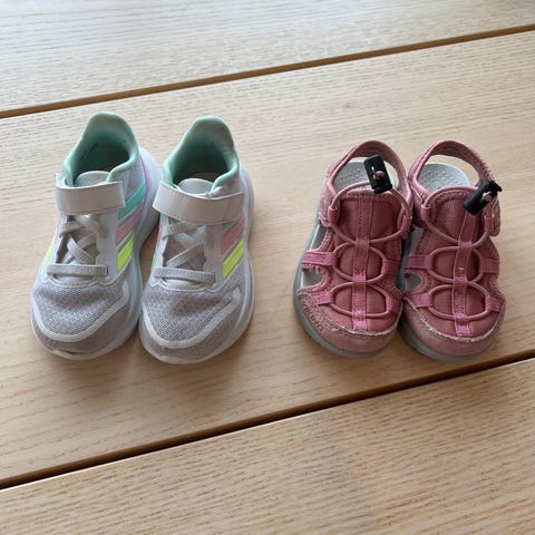 Adidas barne joggesko for unisex i størrelse 24. Skoene har en lys farge med pastellfargede detaljer på sidene. Designet er egnet for barn og har borrelås og snøring for enkel tilpasning og bruk.