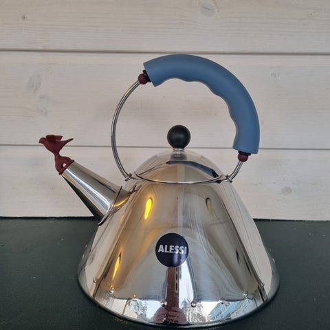The return of a classic! Designed in 1985 by Postmodernist master Michael Graves, the 9093 Kettle is one of the best-selling Alessi designs in the world. The 9093 Kettle is distinguished by its contrast of materials—mirror-polished stainless steel and a blue plastic handle—rivet details near the bottom and, of course, the iconic bird-shaped whistle that sings when your water has reached a boil.