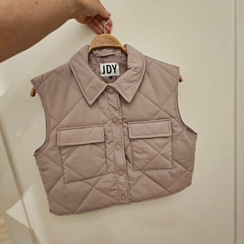 JDY vattert vest i brun farge. Vesten har glidelås foran og sidelommer. Den er uten ermer og har en opprettstående krage. Passer for kvinner.