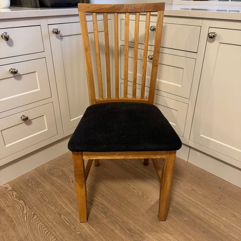 Stol i lys eik med sort kunstskinn selges rimelig. Pent og lite brukt - kun brukt ved skrivebord.