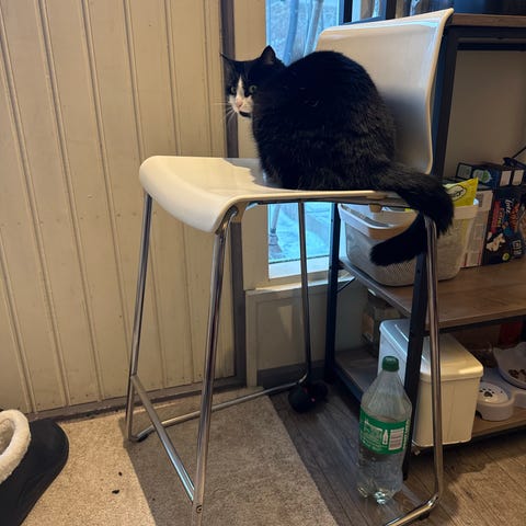 Jeg har ikke bruk for 2 kontorstoler, så gir bort denne selv om Floke like den veldig godt. Kattehår følger med.