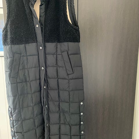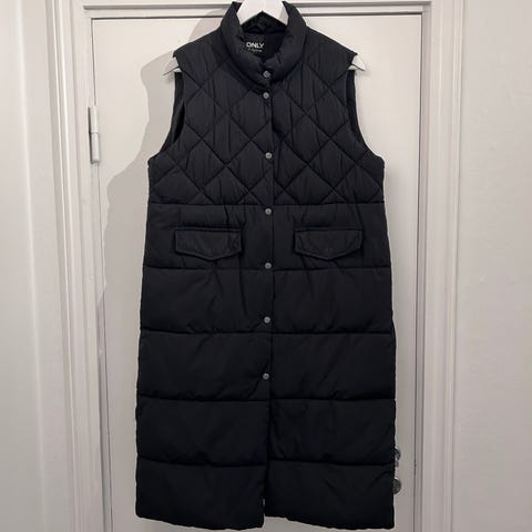 Vesten har rund hals,lommer ,knapper hele veien ned og knapper nederst på begge sidene som kan åpnes for splitt.