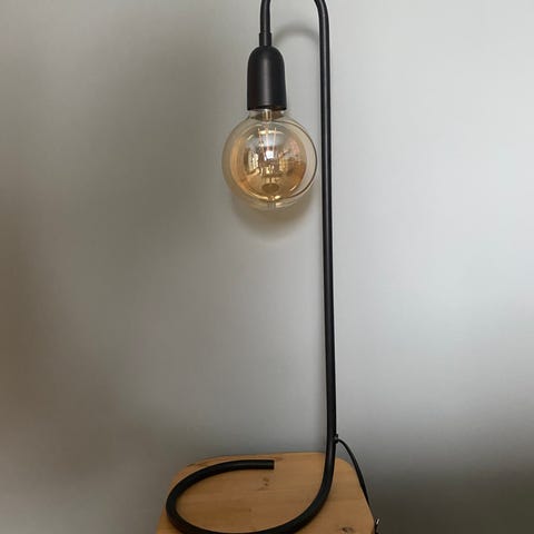 Lampen er ca 140cm høy. Den har vært litt løs i gjengene, så jeg har limt den for at den skal holde seg rett. Ellers virker den som den skal. Sokkel til lyspære er E14.