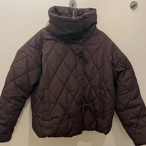 størrelse M. Jakken er brun og laget av polyester. Den har quiltet mønster, trykknapper foran, lommer og ribbestrikkede mansjetter.🤎