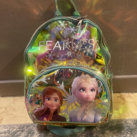 Disney Frozen stoffveske med motiv fra filmen Frozen. Vesken har flere rom med glidelås, en liten frontlomme, og nettinglomme på siden. Passer for unisex bruk.