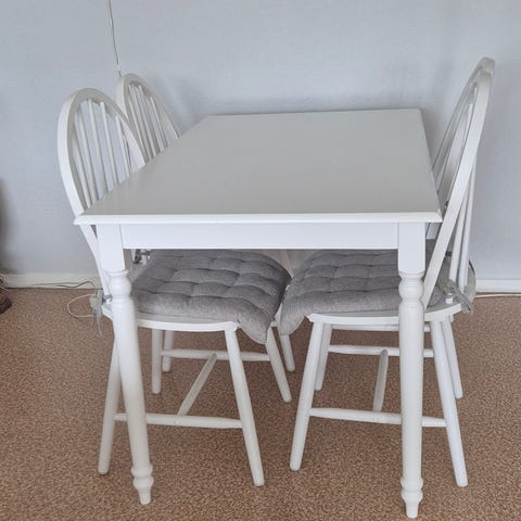 Koselige kjøkkenmøbler selges samlet. Brunbeiset heltre bord med 4 stoler.