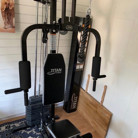 Trojan treningsapparat for styrketrening med vektstabel og kabelsystem. Apparatet er designet for ulike styrkeøvelser og har justerbar motstand basert på vekter. Passer til hjemmebruk for generell styrketrening.