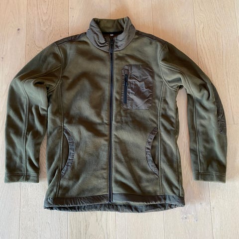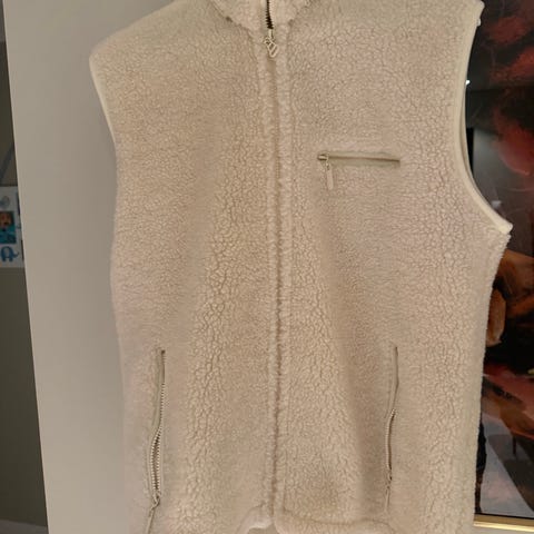 Tommy Jeans fleecevest i størrelse XS, unisex design. Vesten har beige fleece materiale med grønne lommer og oransje detaljer. Flere lommer foran, egnet for utendørs bruk eller som et lag i kaldt vær.