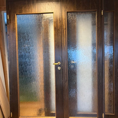 Hvit tredør med seks ruter i glassfelt. Swedor. massiv tre Mål dørblad : 72,5 x 204(standard 80x210 dør) selges med karm men uten dør håndtak .selges 1500