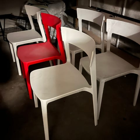 Stolene har et elegant hvitt plastseteskall (teknopolymer) med ovale dekorative hull i ryggdelen, og forkrommede stålrørsbein. Komfortable, lette og solide –tilhørende hvitrundt bord.