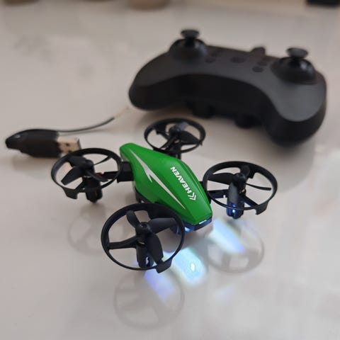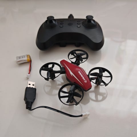 Heron Mini Drone 2.4 GHz fjernstyrt drone med svart farge. Leveres med fjernkontroll, ekstra propeller, lader og verktøy. Størrelse på drone: 5,7 cm. Batteri: 3,7V / 300 mAh Li-ion. Rekkevidde: opptil 40 meter. Kameraoppløsning: 1280 x 720 piksler. Støtter funksjoner som høydehold, 360° flip, og automatisk landing.