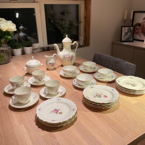 Den er kremfarget med håndmalte blomstermotiver, også kjent som "Saxon Flowers"-mønsteret.