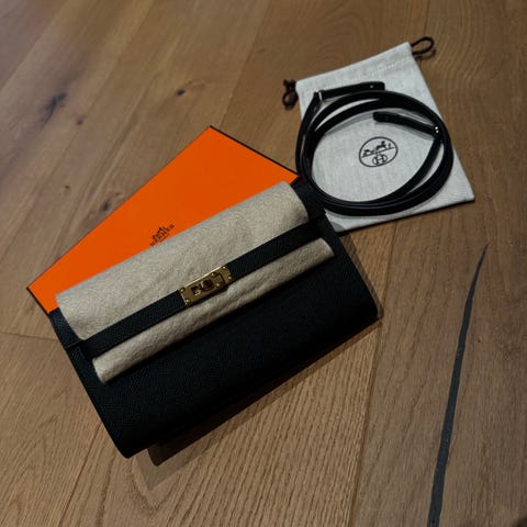 Selger en Hermès Kelly To Go i den klassiske og svært ettertraktede kombinasjonen Black Epsom leather med Gold Hardware. Dette er en tidløs modell som kombinerer ikonisk Hermès-design med praktisk funksjonalitet – perfekt som clutch, crossbody eller elegant wallet-on-chain.