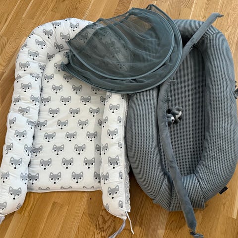 God, myk sengekant, praktiske blokker til å bygge opp seng/krybbe, søt uro med beroligende musikk og koselig pute. Se bilde for detaljer.