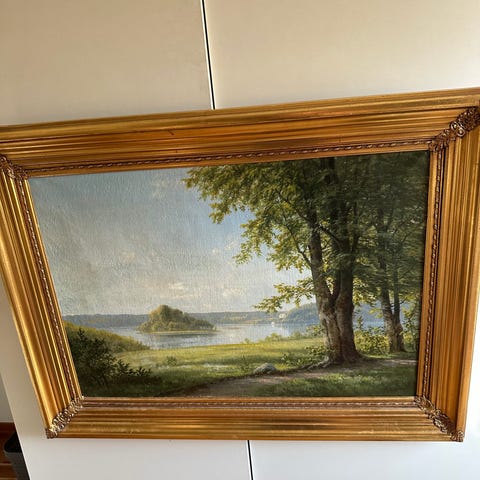 Maleri som viser et landskap med en kirke, hus og trær. Signert og datert 1947. Malt med olje på lerret.