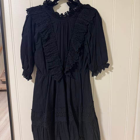Floyd festkjole i størrelse S, svart farge og laget av bomull. Kjolen har detaljer som elastisk midje og dekorative volanger. Veldig pen på. Lite brukt. Kan sende med Finn / helt hjem / post nord eller treffes i Stavanger eller Sandnes / hentes hos meg.