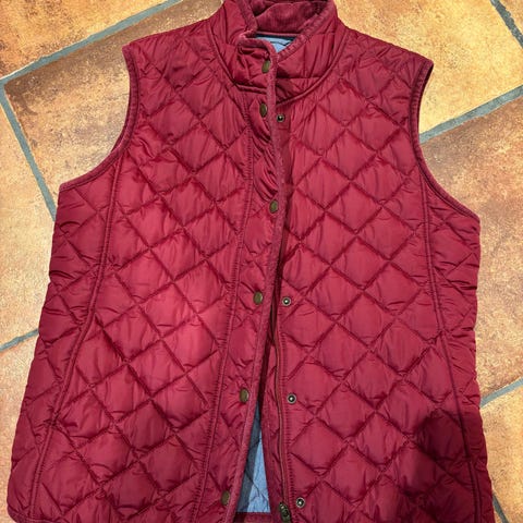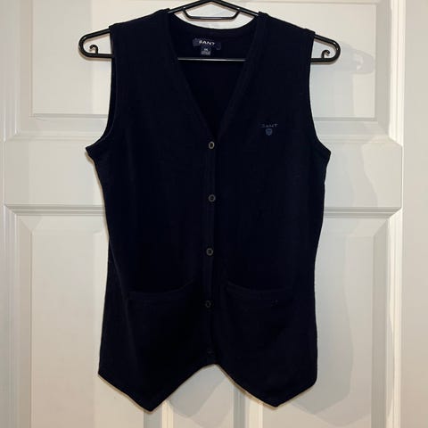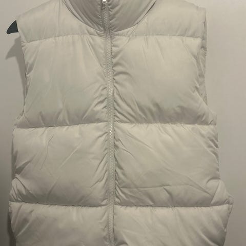 GANT vest i størrelse XL, laget av dunmateriale. Vesten er hvit og designet for kvinner. Den har glidelåslommer med røde detaljer og et brodert emblem på baksiden.