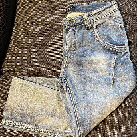 Mid-rise flare jeans med dobbel knappelukking og litt stretch. Passer en som er 170 cm høy.