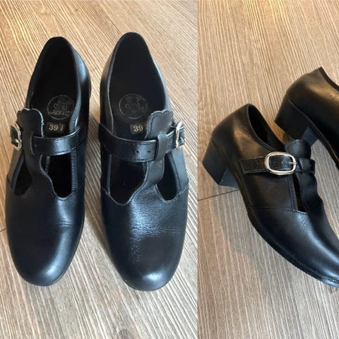 Finn-AI: Hæler i størrelse 40. Skoene er laget i svart skinn og har en stropp med spenne over vristen. Hælene er middels høye og skoene har en rund tåform.
