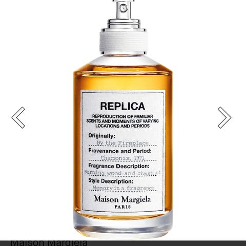 Maison Martin Margiela Replica parfyme med hovednoter av vanilje, base noter av Peru balsam og kashmir, og mellomnoter av kastanje, guaiac-tre og einer. Duften har aksenter av nellik, rosa pepper og appelsinblomst. Flasken inneholder 100 ml parfyme. Lite brukt.