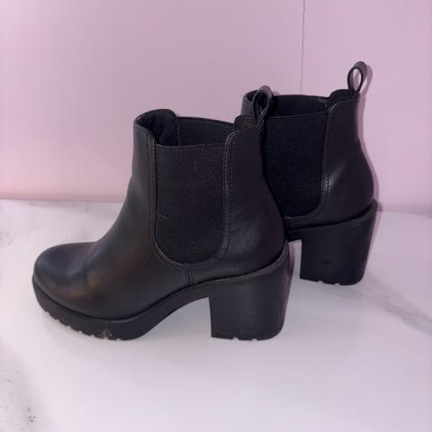 Kraftig såle gir varme, bred og rett blokkhæl gir god stabilitet og komfort å gå i.