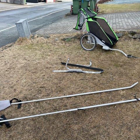 Komplett sett med hjul, drag og ski. Sammenleggbar. Passer for 1–2 barn. Trygg og solid konstruksjon