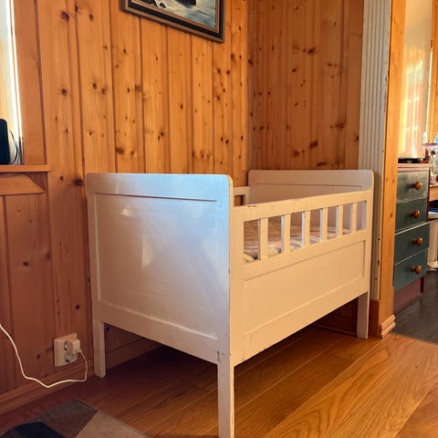 barneseng, meget god stand. sprinkelseng med hjul som kan tas av. den kan tas av på den ene siden og gjøres om til en vanlig seng, eller skyves til foreldrenes seng. selges med madrass