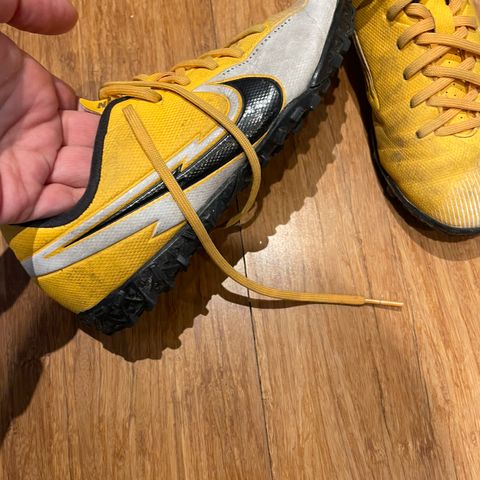 Adidas Nemeziz fotballsko i størrelse 38. Skoene har et mønster i hvitt og svart med gule detaljer. Passer for bruk på innendørs underlag.