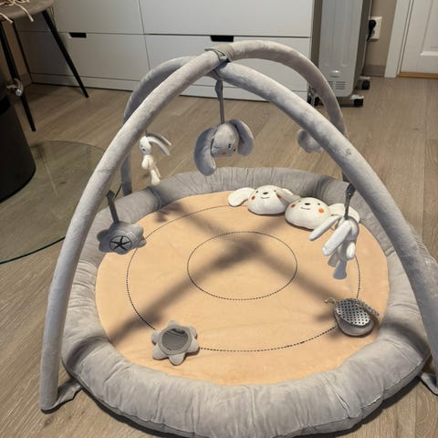 Helt nydelig babygym i tre selges inkl. tilhørende hvit matte. Matten blir vasket og klar for ny eier. Stativet blir demontert ved eventuell sending. Det er noen skraper etter andre leker. Se bilder Nypris 430kr.