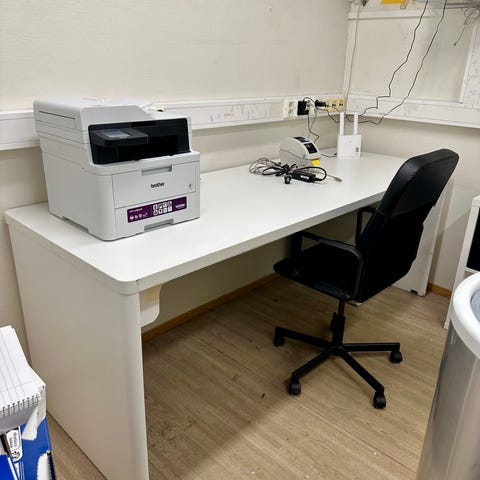 Kontorpulten er pent brukt og kan stilles opp etter ønsket høyde