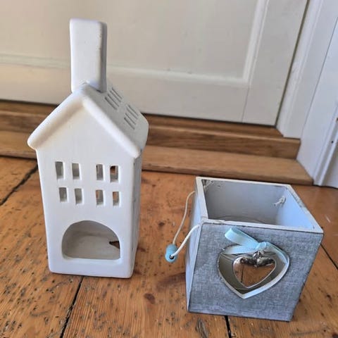 Sett med telysholdere, to hus. Faktisk aldri prøvd med lys inni, bare brukt som pyntegjenstander.