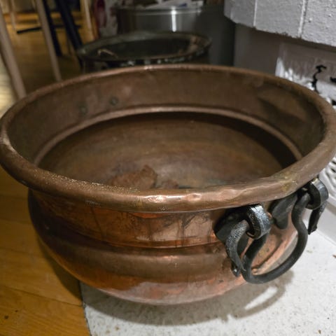 Kobberkjele, kobber kurv, vedkurv, vedgryte, vedbøtte, vedbalje, isbøtte, gryte, bøtte, balje, kobber, metall, vintage kobber, antikk, dekorasjon, pynt, hytte, landlig stil, copper bucket, copper bowl, dekorativ pynt vedkurv vedgryte vedbøtte vedbalje gryte bøtte balje kobber metall
